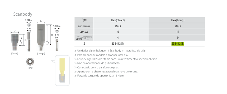 O Scanbody é um corpo de prova de alta precisão para o fluxo de trabalho digital. Feito em titânio com um revestimento especial que dispensa o uso de pó, ele serve para capturar a posição exata do implante em scanners intraorais e de bancada.