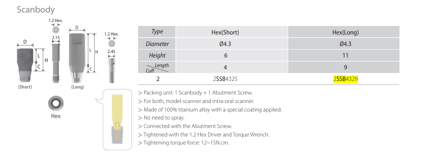 O Scanbody Hex Ø4.3 é um componente essencial no fluxo digital da implantologia, projetado para garantir máxima precisão na digitalização de implantes, tanto em scanners de modelos como em scanners intraorais. Fabricado em liga de titânio 100% com um revestimento especial, este scanbody oferece alta resistência, excelente compatibilidade biológica e fiabilidade na captura de dados digitais.